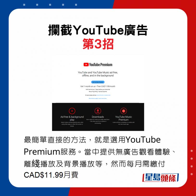 另一最简单直接的方法,就是选用YouTube Premium服务。当中提供无广告观看体验、离线播放及背景播放等,然而每月需缴付CAD$11.99月费。