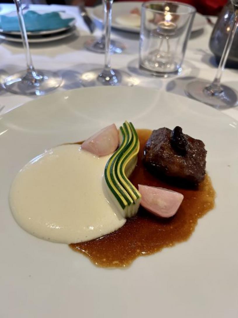 6.布兰特湖和牛上肩里脊(36HR BRANT LAKE WAGYU ZABUTON):马铃薯泡沫、西葫芦、萝卜、奥卡纳根樱桃、红酒酱汁(potato foam, courgette, radishes,okanagan cherry, red wine jus)