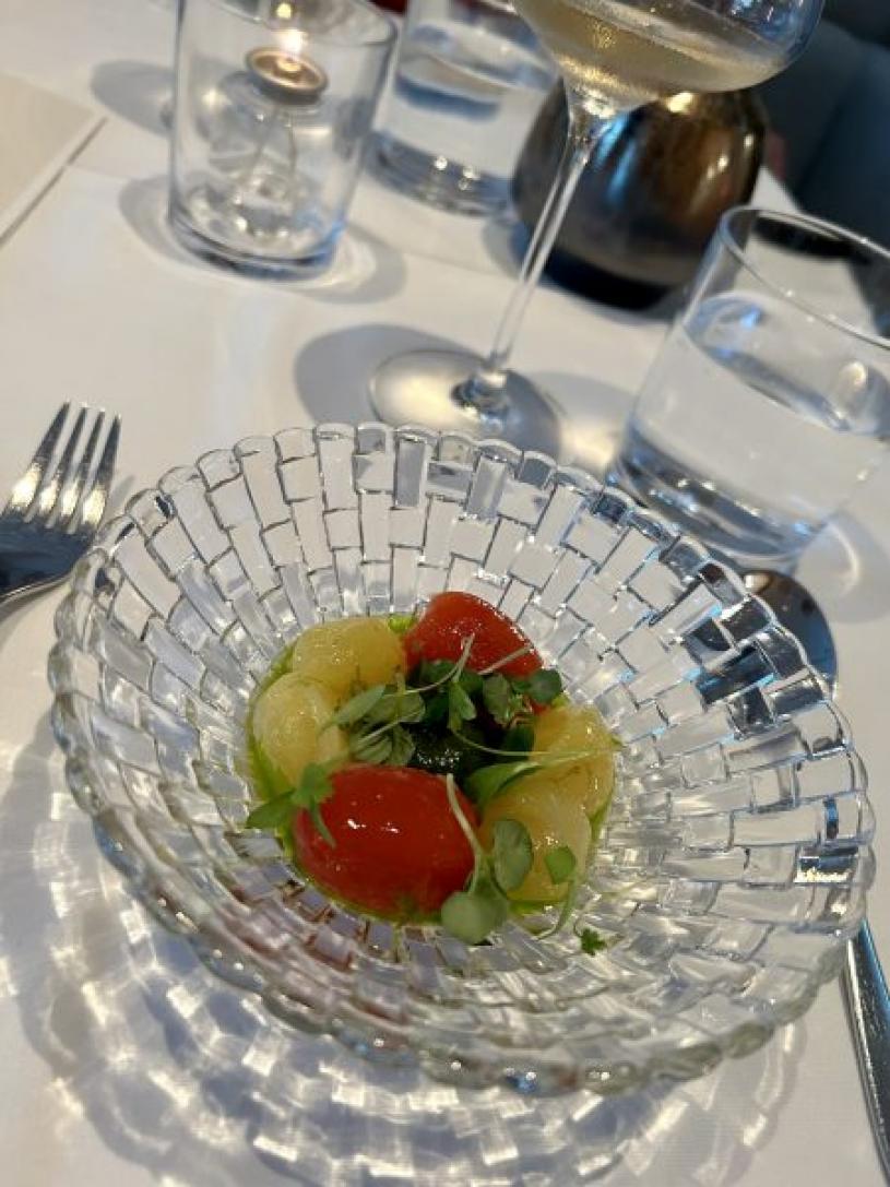 2. 番茄(TOMATO):泰式罗勒雪葩、绢豆腐、莱姆酱、陈年鱼露(thai basil sorbet,