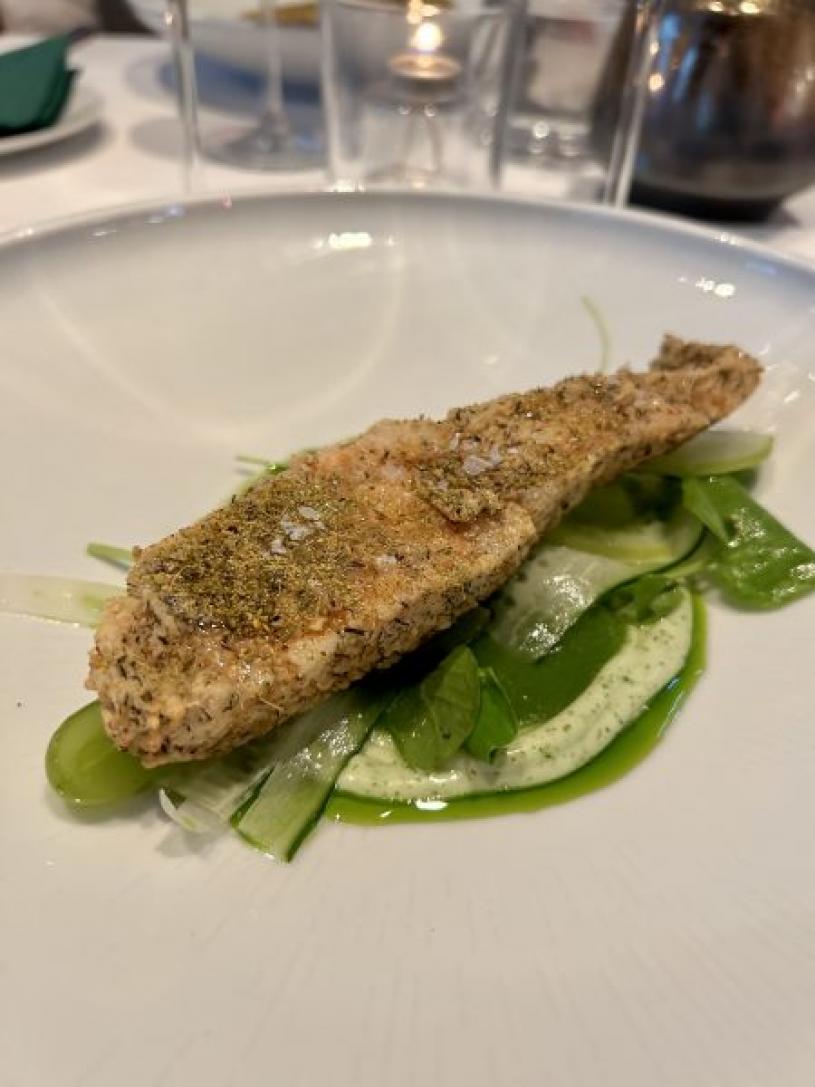 5. 干煎钢头鳟(FRIED STEELHEAD TROUT):黄瓜西班牙凉菜汤、苹果、西洋菜、莳萝优酪(cucumber gazpacho, apple,watercress, dill yogurt)