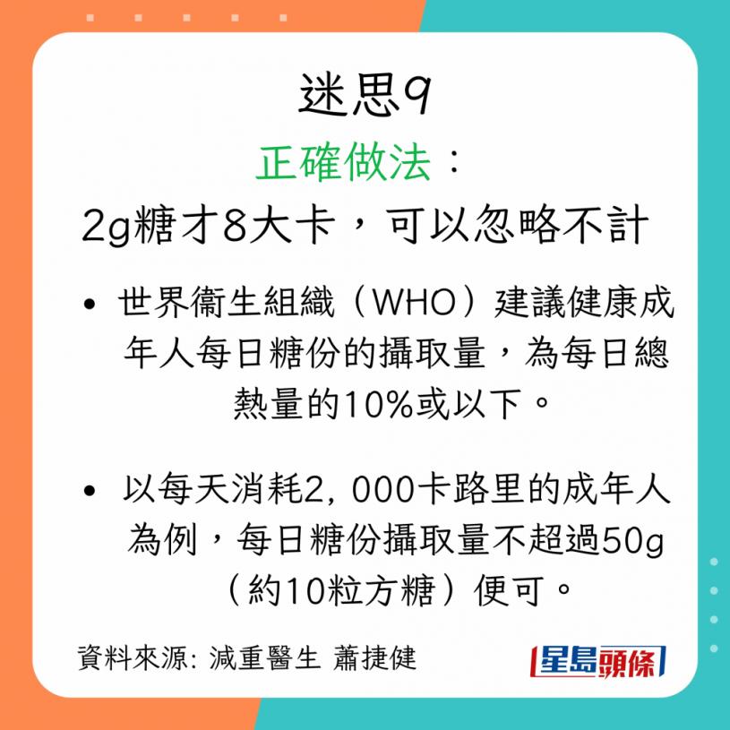 以每天消耗2, 000卡路里的成年人为例,每日糖份摄取量不超过50g(约10粒方糖)便可。