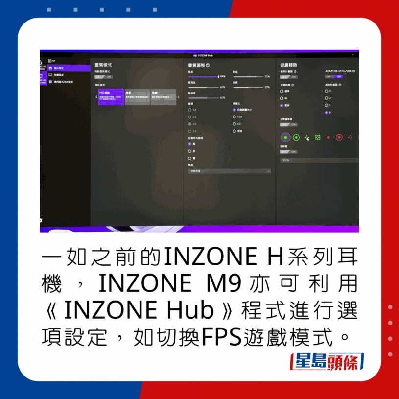 Sony早前推出专为打机而设的INZONE电竞系列,除了无线及有线耳机,其实还有电竞芒,当中INZONE M9具备4K解像度及144Hz更新率,同时拥有全列阵背光及600nits亮度,配合特设FPS模式及一系列游戏辅助功能,流畅打机之余,还有出色画面体验。