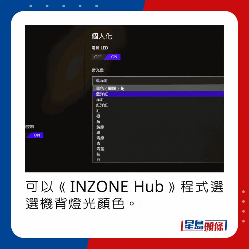 话说回来,INZONE M9采用4K IPS面板(解像度3,840×2,160),支援144Hz画面更新率及1ms GtG灰阶反应时间,且具备95% DCI-P3色域及DisplayHDR 600认证,画面反应快、色彩准确及亮度充足之余,由于用上同厂电视的Full Array全列阵背光技术,在控制画面光暗方面更为精准,玩家更可以按游戏类型切换高、低2级分区调光。