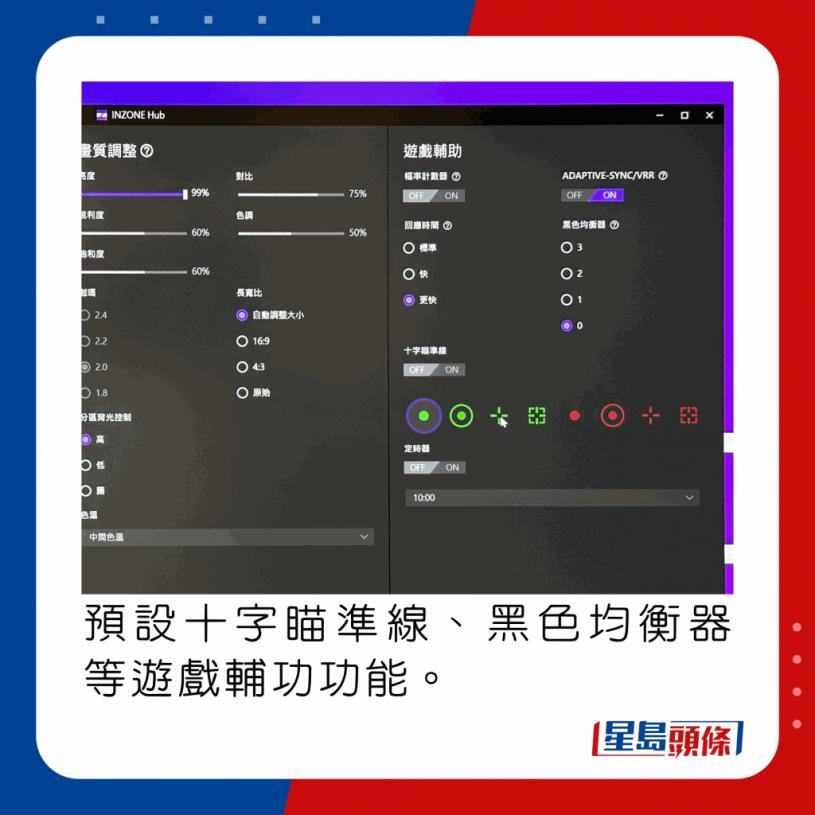至于另一台INZONE M3同样是27吋IPS型号,跟M9主要分别在于荧幕解像度只有全高清(1,920×1,080),亮度为DisplayHDR 400,支援99% sRGB色域,但更新率高达240Hz,画面流畅度更高,而上述介绍针对游戏的画质提升及游戏辅助功能,都可以INZONE M3身上找到。