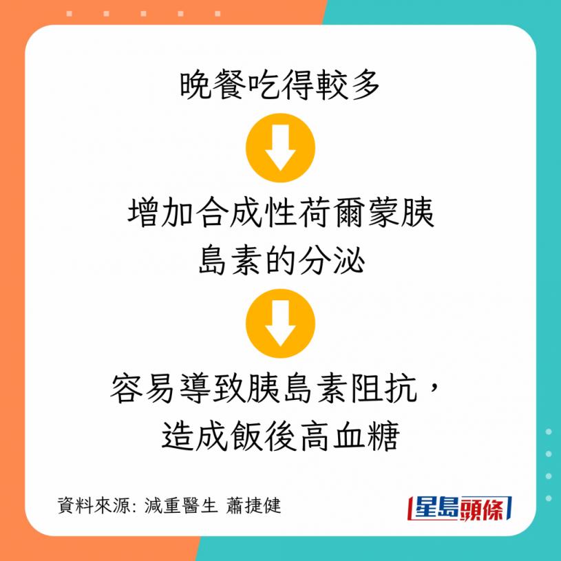 晚餐吃得较多,增加合成性荷尔蒙胰岛素的分泌,容易导致胰岛素阻抗,造成饭后高血糖。
