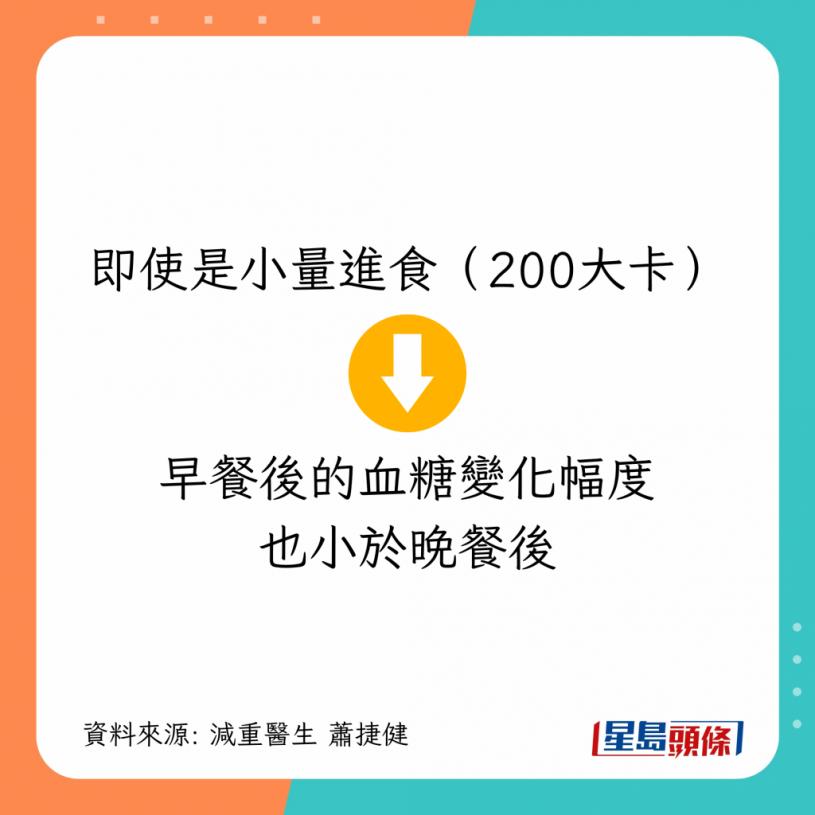 萧捷健医生指,2020年,德国Luback的一项研究找来了体重正常的受试者,留他们在实验室里进行为期三天的实验。实验分为早上多吃(早餐摄取的热量占全天总热量的69%)组和晚上多吃(晚餐摄取的热量占全天总热量的69%)组,而每天所摄取的总热量是相同的。