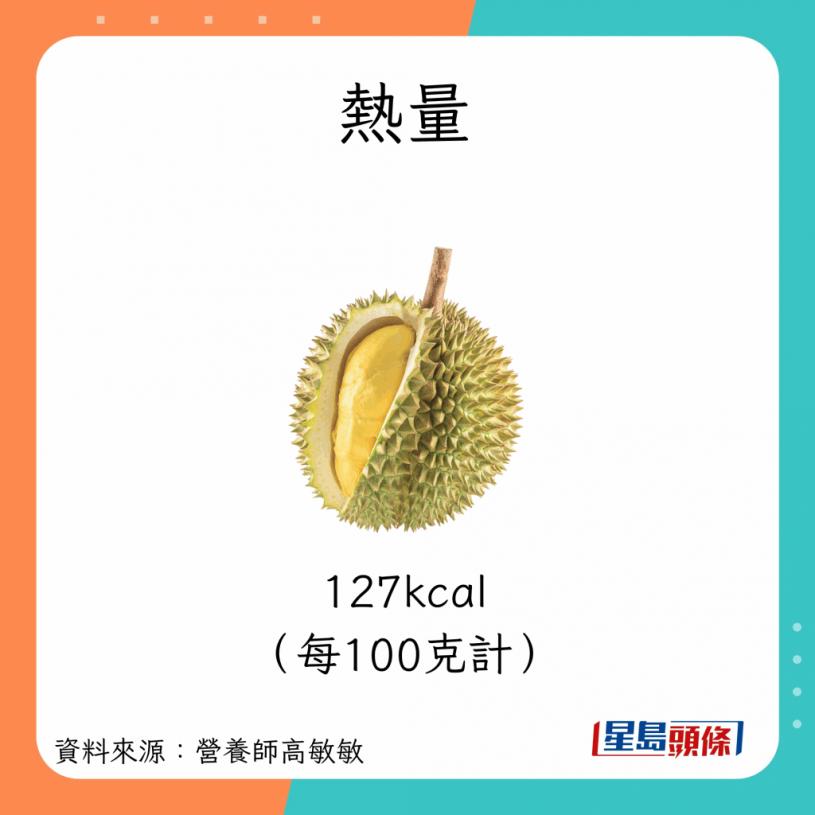 高敏敏指出,榴莲含有丰富营养素,适量进食对身体有益处。以每100克榴莲计算,热量为127kcal。她提醒,榴莲热量偏高,要注意摄取量,建议一次只吃一个细饭碗,或者一个拳头的份量,即大约50g。