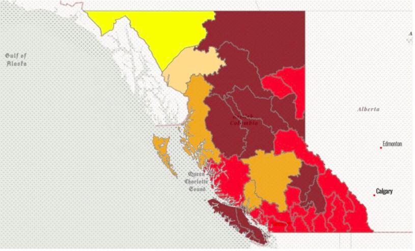 加拿大自然资源部(Natural Resources Canada)将加拿大的火灾天气指数用作“火灾危险的一般指数”,周五,卑诗省南部内陆和南海岸的大部分地区处于高至极端水平。