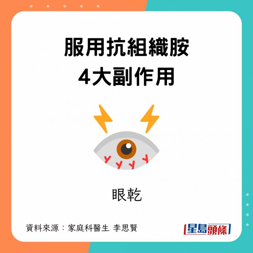 李思贤医生表示,治疗对组织胺的过敏反应,可以服用抗组织胺,即可借由阻断组织胺受器和组织胺的反应,达到避免不舒服症状的效果。不过,这种药物也会引起不少的副作用,常见影响如下: