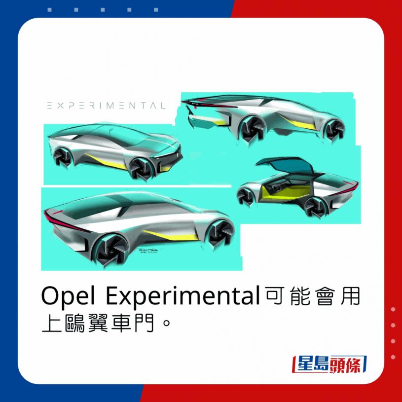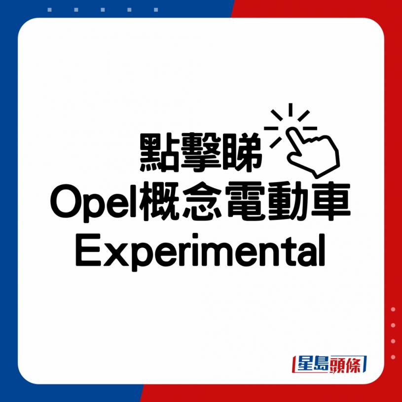 Opel Experimental外形略带GT X Experimental的影子,车身完全没有镀铬装饰,取而代之是采用大量抢眼图形及灯光突出未来感,如车头分别用上品牌的Blitz标志,以及由左右细长头灯组成的特色指南针,至于车尾同样以尾灯呈现十字指南针作呼应。既是概念车款,Experimental车厢内部也加入了不少创新设计元素,由于矩形軚盘采用线控转向,故不使用时可以折叠收起,令空间变得更宽敞,最夸张是传统车载娱乐系统荧幕飞走了,所有行车资讯及娱乐内容均通过扩增投影系统,以悬浮方式投影出来,系统将会整合AI智能及支援语音操控。此外,倒后镜由整合到C柱的180度镜头所替代。Opel暂未有公布Experimental概念车的动力输出、电池及续航等规格资料,只表示采用Stellantis最新的BEV平台,配备4驱系统,期望下月慕尼黑展出时,车厂会有更多资料公开。