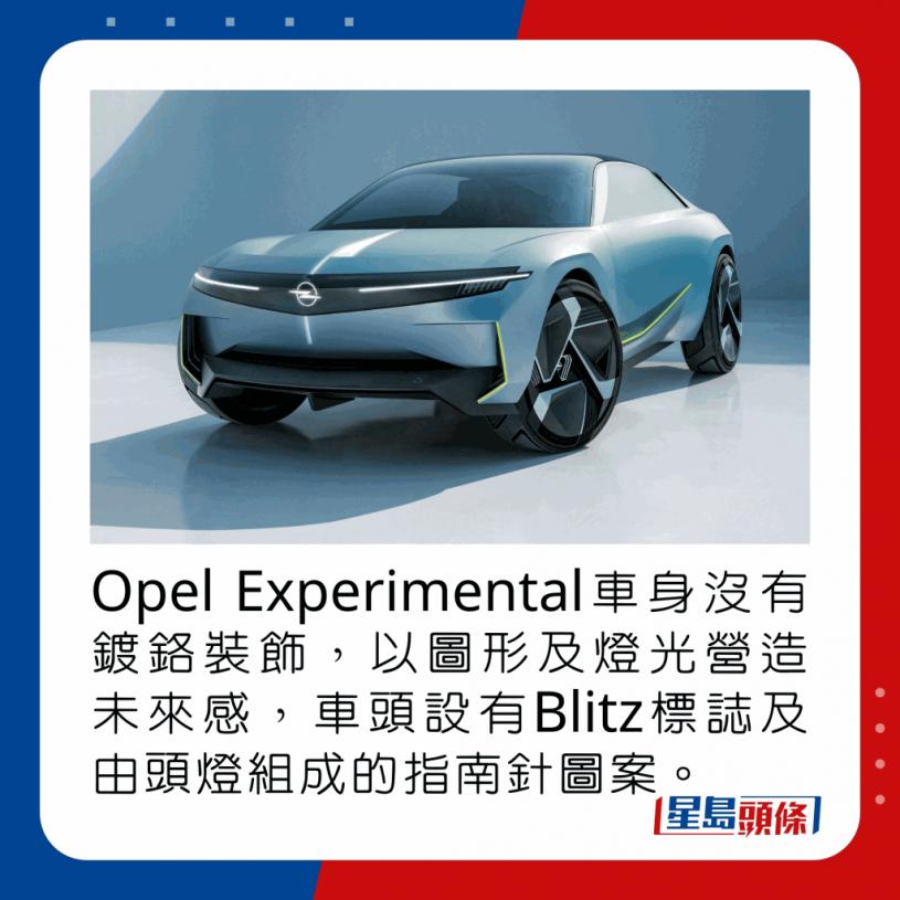 Opel Experimental车身没有镀铬装饰,改以抢眼图形及灯光营造未来感,车头设有Blitz标志,并以头灯组成指南针图案。
