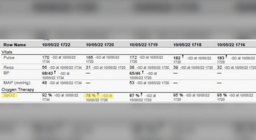 根据多伦多CTV新闻查阅的医疗纪录,婴儿出生后呼吸困难,需要插喉,但喉管不知何时脱落,导致她的氧气水平下降到建议水平以下。