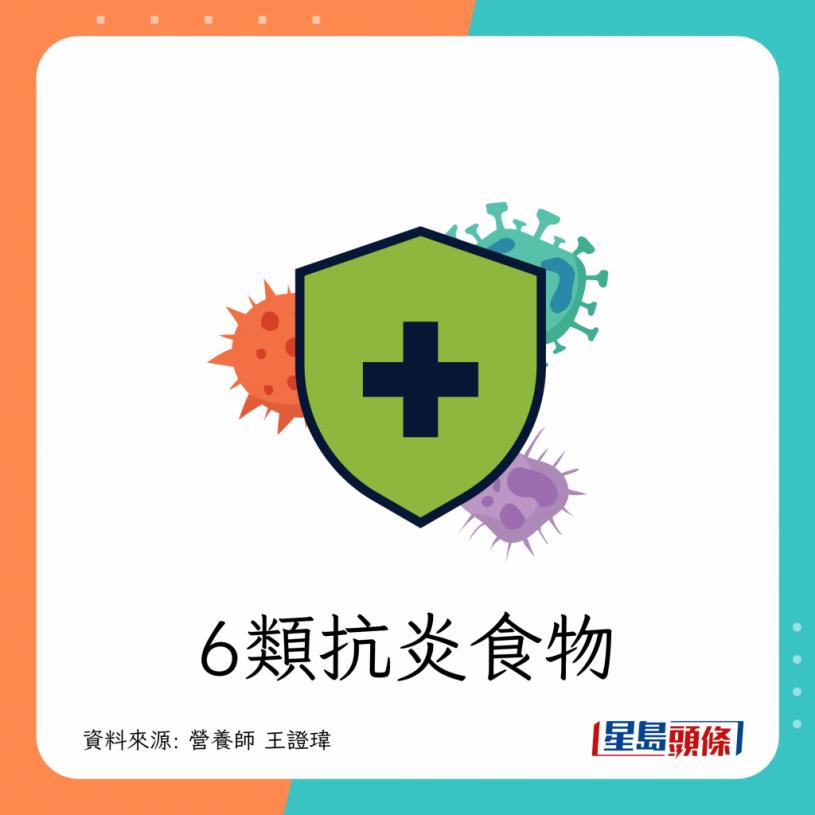 除了减少以上食物的摄取外,营养师王证玮建议,可以补充对抗发炎、抗自由基的食物,以降低发炎的机会,例如: