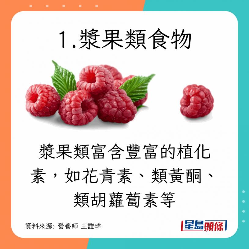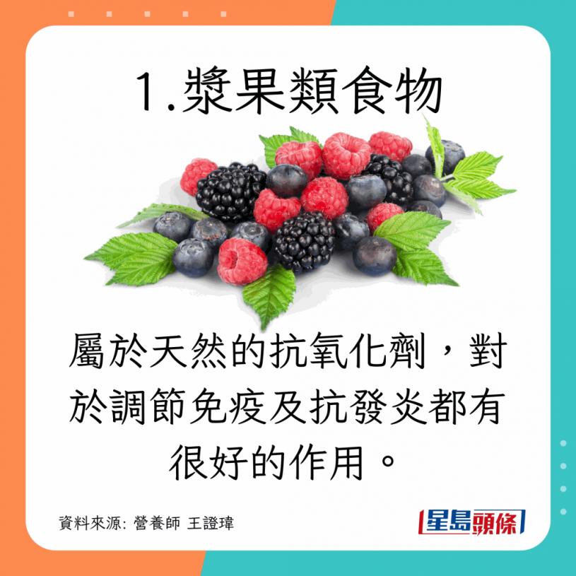 营养素及功效:浆果类富含丰富的植化素,如花青素、类黄酮、类胡萝卜素等,是天然的抗氧化剂,对于调节免疫及抗发炎都有很好的作用。