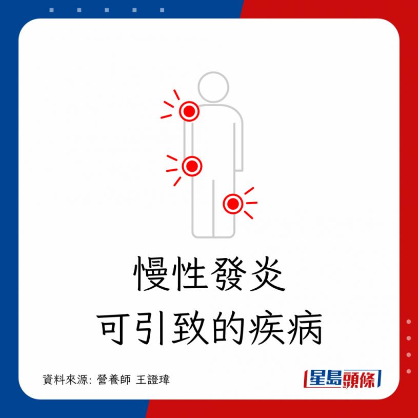 营养师王证玮在其facebook专页发文指,慢性发炎就如身体长期火灾,令自由基不断生产,引致细胞组织被攻击。他指出,不少研究已证实,身体长时间发炎会造成慢性疾病,严重起来可导致:肥胖、糖尿病、心血管疾病、癌症。