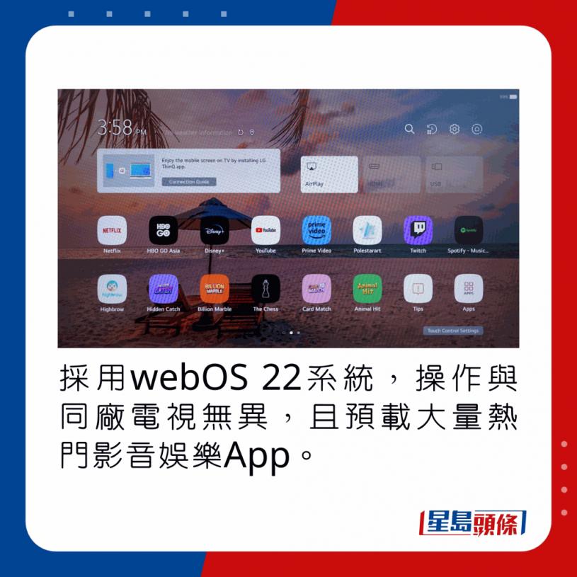 采用webOS 22系统,操作与同厂电视无异,且预载大量热门影音娱乐App。