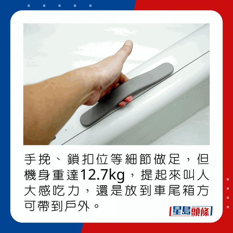 手挽、锁扣位等细节做足,但机身重达12.7kg,提起来叫人大感吃力,还是放到车尾箱方可带到户外。