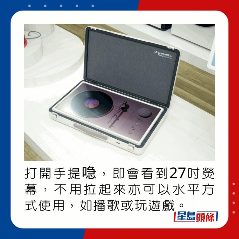 话说回来,LG StanbyME Go虽然不像StanbyME有4个辘可以推来推去,但荧幕显示角度比后者更灵活多变,如打开手提喼,就可以直接水平放着使用,包括以模仿黑胶唱盘的显示效果播歌,又或开启预载游戏,跟小朋友玩些益智小游戏。水平以外,由于27吋荧幕背后装有支撑架,拉出来后可调节倾斜度至最大90度,以及升高最多18cm。一如StanbyME,StanbyME Go也可以把荧幕90度旋转至垂直显示,方便观看YouTube等串流平台的直度影片。