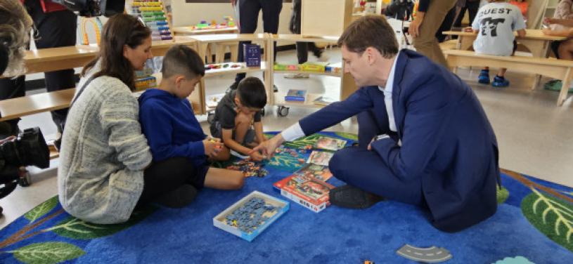 尹大卫在托儿中心与现场孩子和家长互动,还抽空与孩子玩了游戏卡和拼图。他称省府全力资助家庭,让父母和孩子都能享受无忧的学习环境。