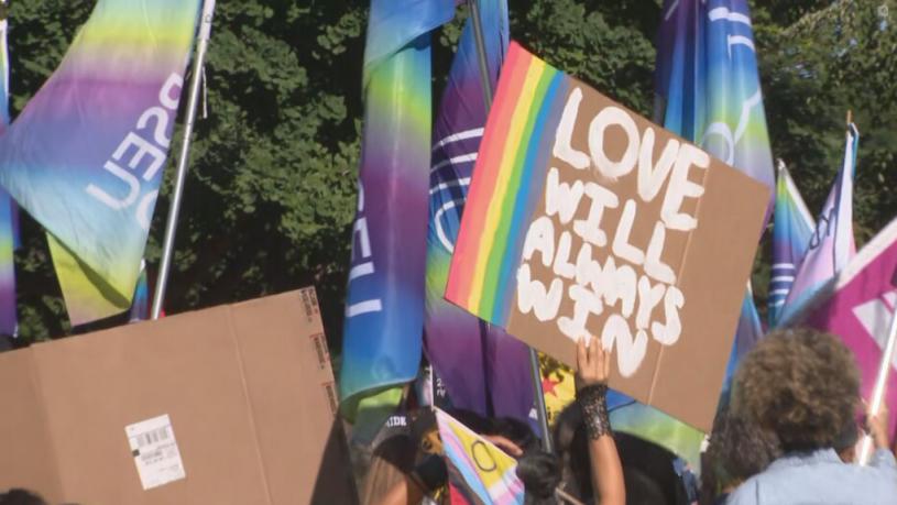 在各地反对学校性别认同教育的抗议现场中,都有人站出来表达对 LGBTQ 学生的支持。