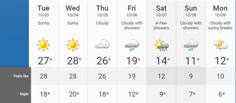 虽然多伦多周二至周四日间最高气温达到25度,但周日及周一日间最高气温将急剧下降至摄氏12度。