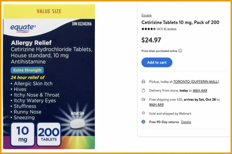 该药物为Life Brand,里面装有 84 片西替利嗪(Cetirizine),Shoppers Drug Mart以53.99元售出,网店售价则为52.99元。相比下,Walmart自家品牌Equate 的相同产品200粒相同尺寸的售价为24.97元。