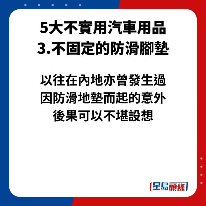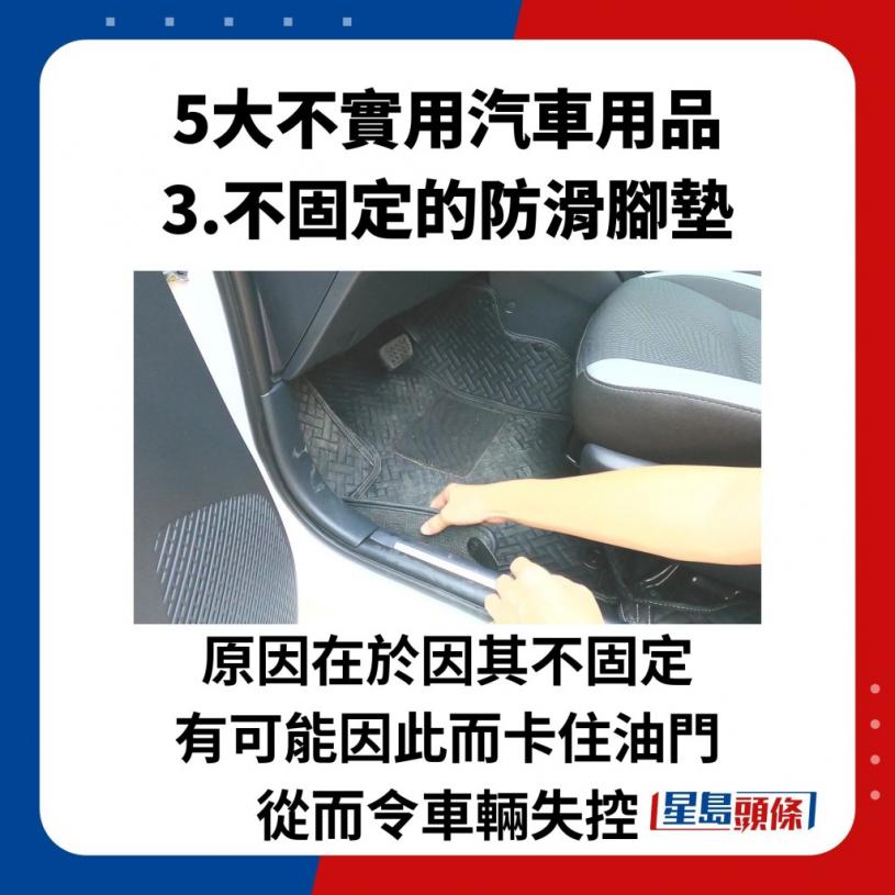 本来在车上放上防滑地垫或地毯都是正常不过的事情,不过,这类没有固定的防滑地垫原来会为驾驶者带来致命的危险性。原因在于因其不固定,有可能因此而卡住油门,从而令车辆失控,以往在内地亦曾发生过因防滑地垫而起的意外,后果可以不堪设想。