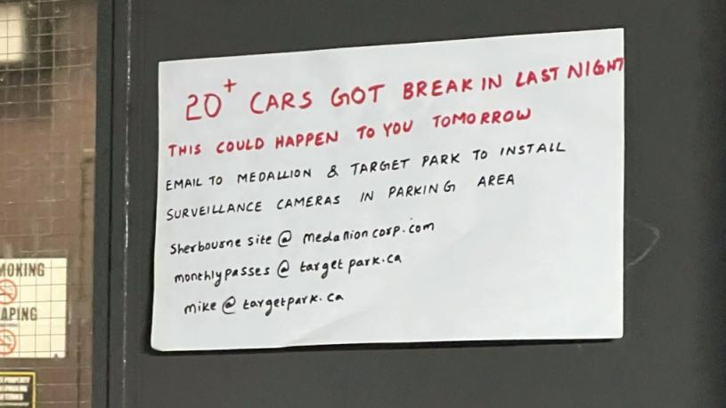 【星島綜合報道】多倫多市中心三棟公寓大樓的居民稱,一周內有20輛汽車被闖入,甚至有車主於車窗貼上紙條,表明車輛是空的。