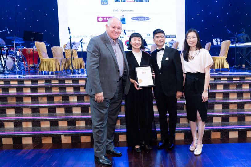 万锦市长薛家平 (Frank Scarpitti,左一) 及市议员李思韵(右一)在晚宴开始前向华咨处董事会副主席史伟恩及行政总监林承昌送上贺信。