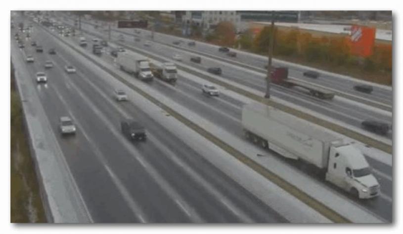 上午11点30分左右,交通录影机Durham地区401高速公路上的雪花,Pickering和Ajax的道路因为降雪又湿又滑。