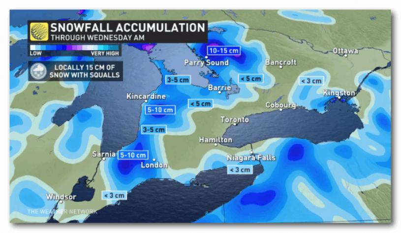 另一场分散的雪暴将包围Georgian Bay、休伦湖和尼亚加拉半岛部分地区。