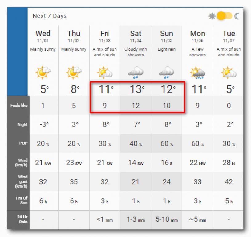 周末气温将有所回升,预计本周五多伦多地区日间气温升至11度,体感温度9度。周六和周日将有雨,日间气温在13度左右,体感12度。下周二气温又将降至个位数。
