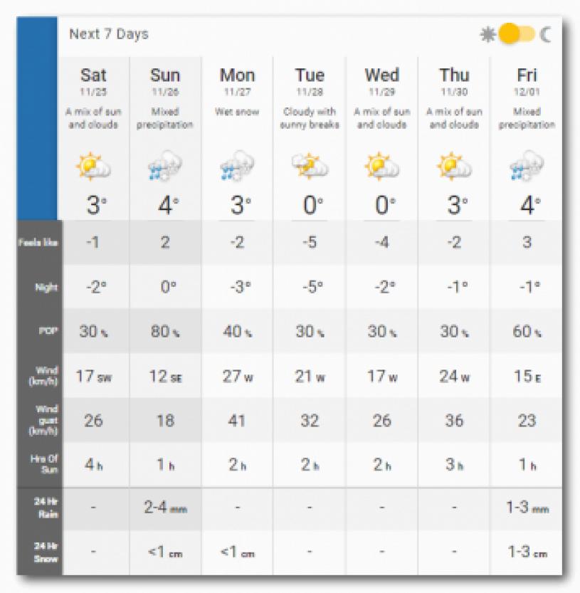 多伦多周五的天气预报显示气温最高只有0度。而在经历了今夜零下7度的寒冷之后,周六将迎来一个晴朗的天气,而周日可能会有阵雨。
