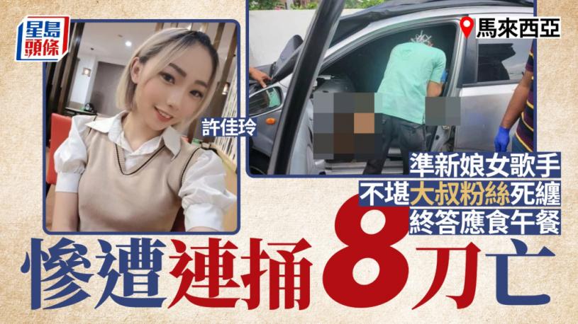 馬來西亞巴生區周一發生一宗駭人命案,當地一名準備結婚的貌美女歌手許佳玲,昨午與一名40多歲的中年追求者吃飯後離開餐廳,之後被人連捅八刀身亡。事後有人更將許女擄上車。