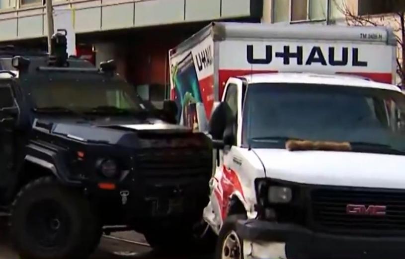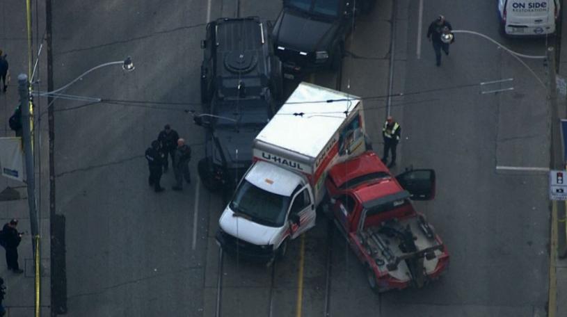 警方今日驾驶装甲车,于Carlton夹Church streets拦腰撞向涉事U-Haul货车,并拘捕车上49岁男疑犯。多伦多警队督察Maher Abdel-Malik表示,调查人员于今日早上于Danforth夹Warden地区,在一辆失窃U- Haul车辆上找到疑犯。