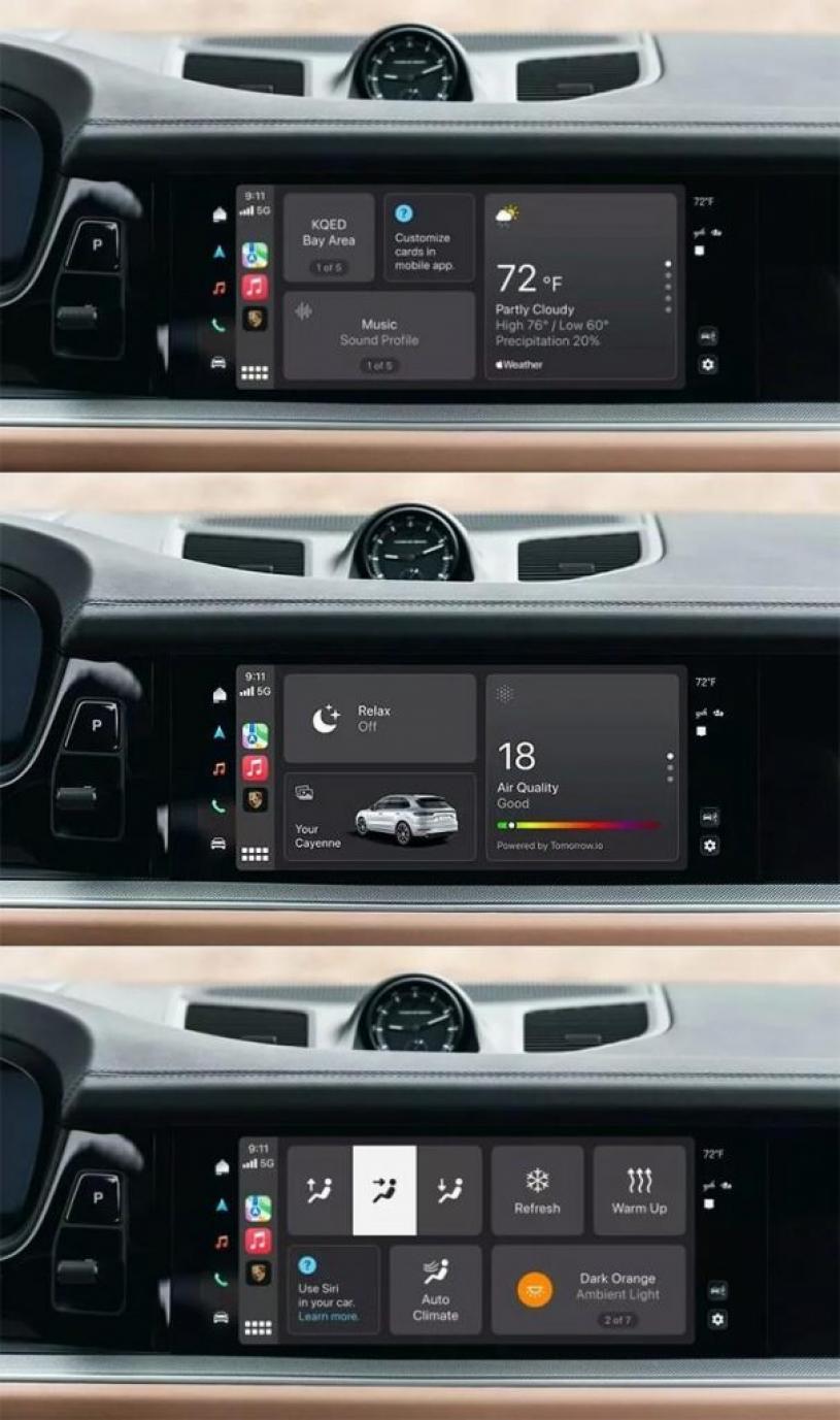 事實上,2023年保時捷Cayenne小改款已加了部分新Apple CarPlay功能,令駕駛者可以經CarPlay調節車廂氣氛燈、溫度等等。至於由保時捷展示的新一代CarPlay佈局所見,不論儀錶板、中控台,又或客座熒幕,所有熒幕均被CarPlay全面接管,以統一介面風格,各熒幕分工顯示不同資料,如應用程式App集中於中控台,客座熒幕以Widgets小工具顯示日程、天氣、音樂等資訊,軚盤前的儀錶板則變成數碼版3環,駕駛者可按個人喜好,自訂車速、轉速、油表、引擎溫度等儀錶組合。