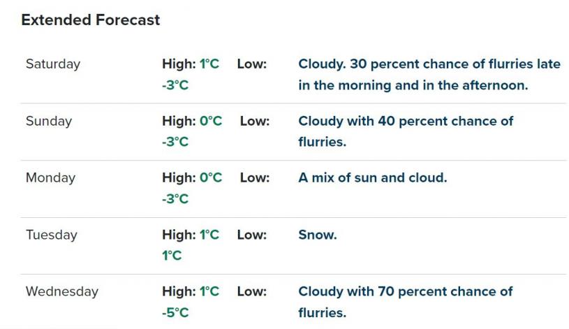 Taylor预测,部分地区的积雪会超过五厘米,周六晚上或需要出动雪铲。预测会在周六晚上7时左右开始降雪,为大多区大部分地区带来约5厘米积雪,但湖泊效应或会使部分地区的降雪量增加。