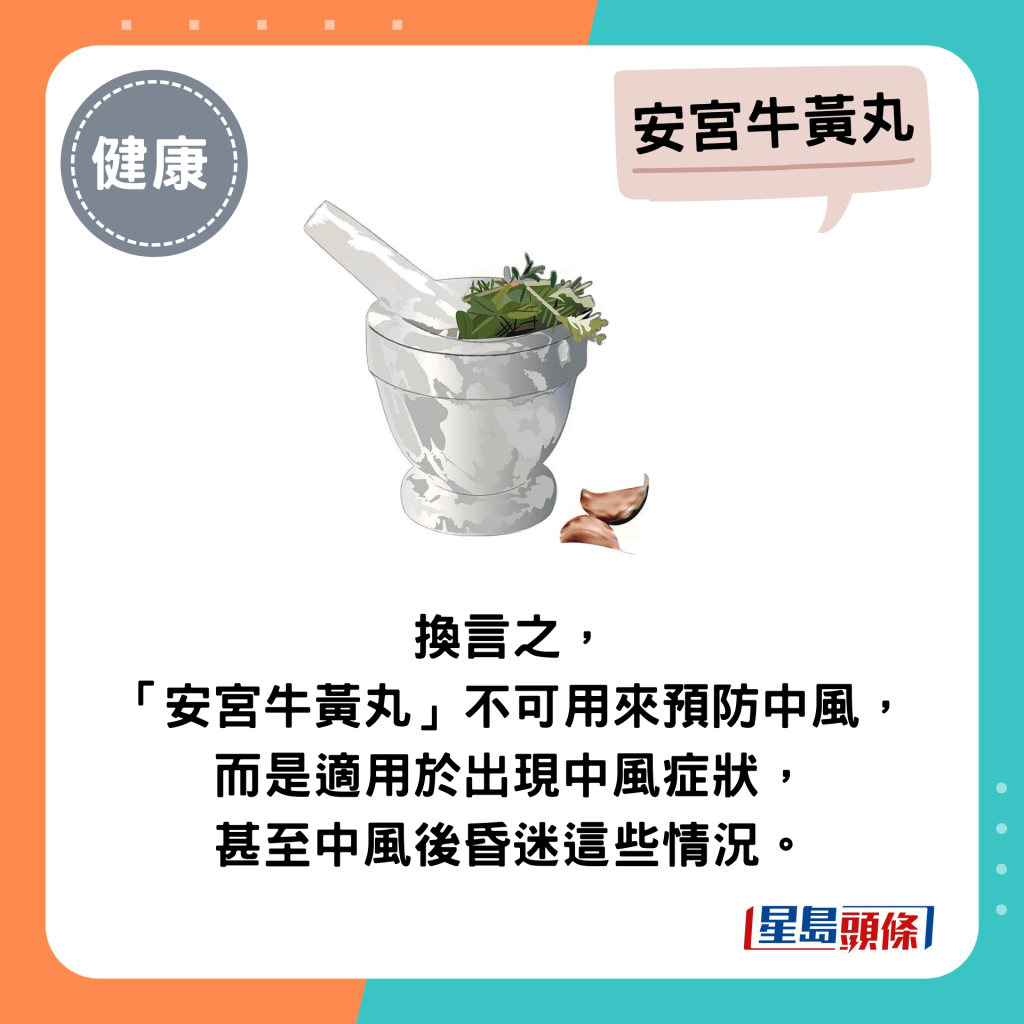 既然不能預防中風,那麼安宮牛黃丸真正用途到底是甚麼?註冊中醫師馬琦傑強調,安宮牛黃丸是用作急救的中藥,絕不能當日常保健品服用,不可以無端端一個月吃2、3顆。
