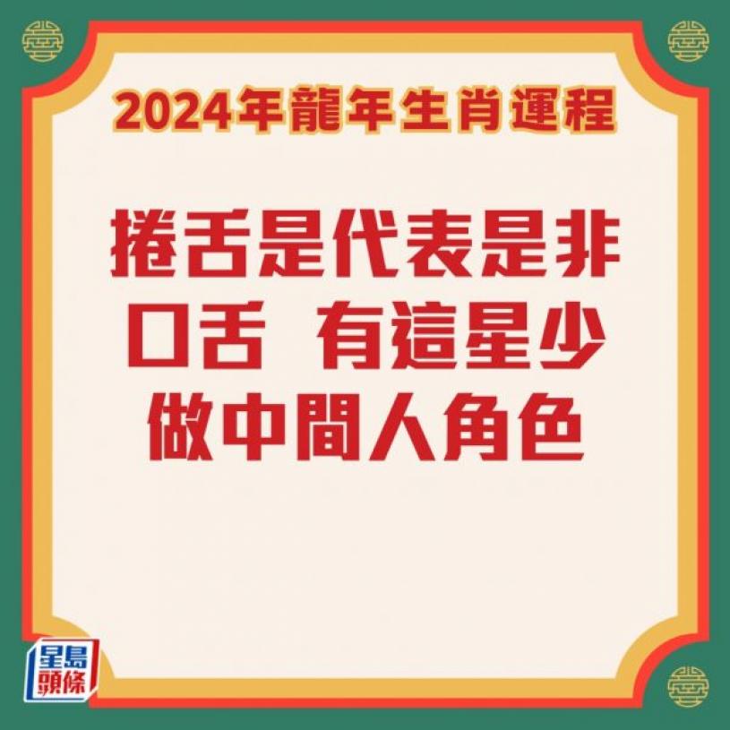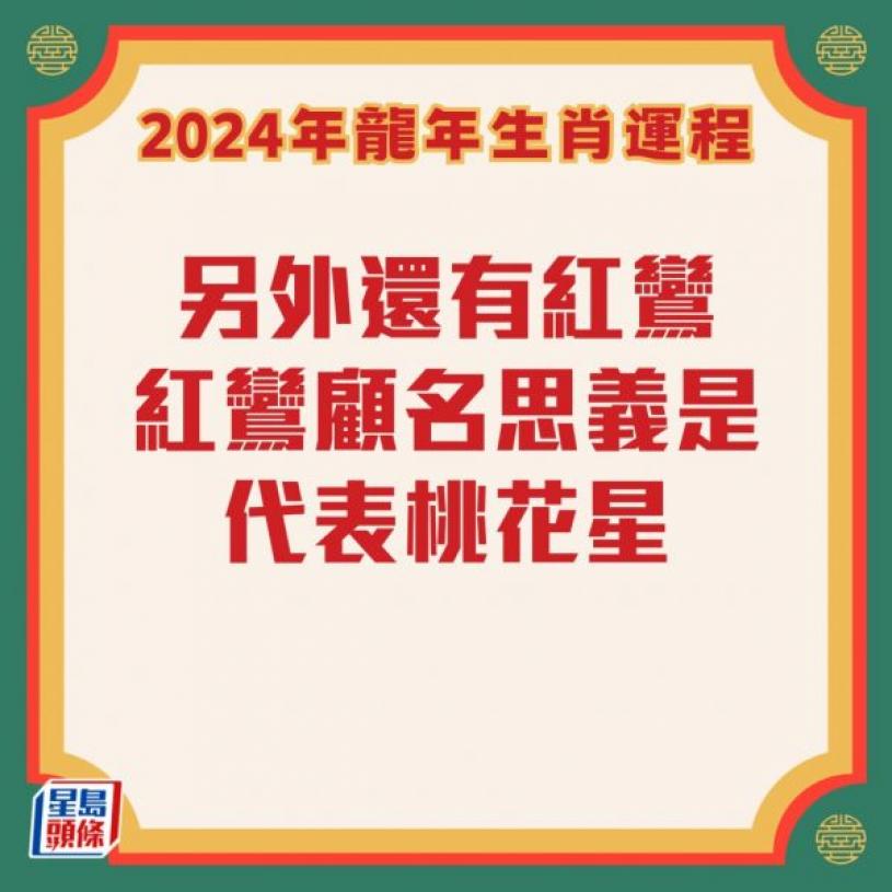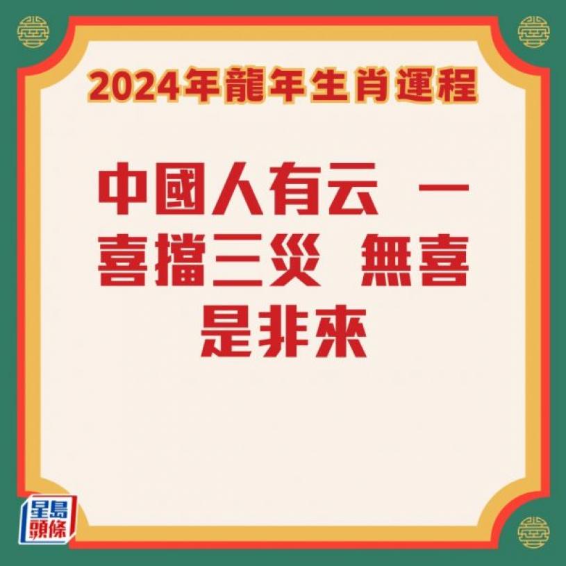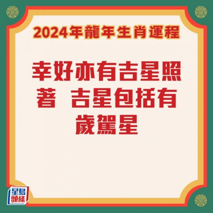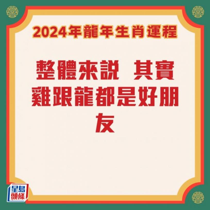 凶星方面有小耗星代表小破財,咸池桃花是短暫桃花,今年不要待人太熱情,否則容易有三角關係。整體來說,其實雞跟龍都是好朋友,大部份時間都算是順暢,