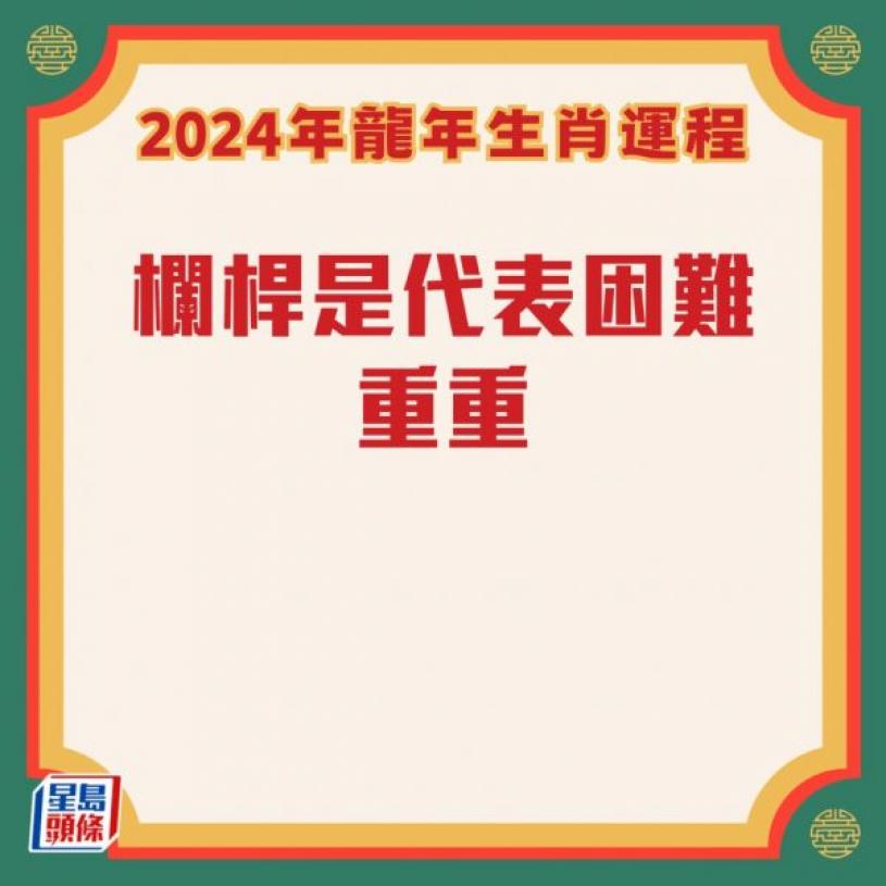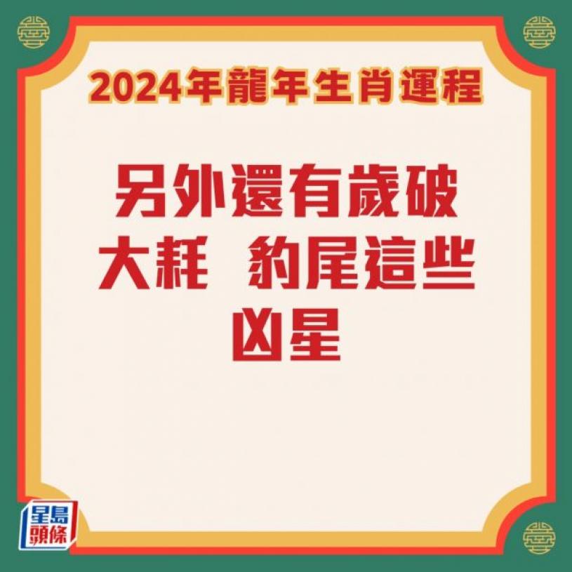 不過,今年的人際關係真的要非常小心,因為有欄桿凶星,另外還有歲破、大耗 豹尾這些凶星。欄桿是代表困難重重,歲破是會得罪重要的人,大耗是大破財星,所以今年投資盡量要保守一點。而豹尾就是踏到豹的尾巴被咬一口,所以今年是容易得罪人。