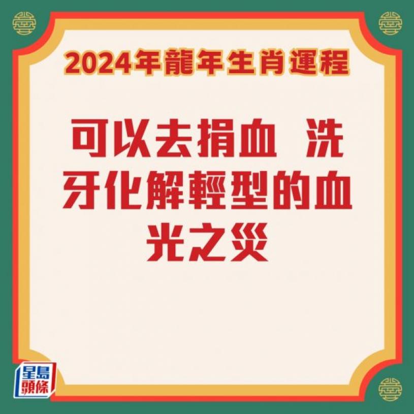 要留心的凶星就是病符星及陌越星,病符代表小病痛,傷風感冒會多一點。而陌越代表面對陌生環境帶來的壓力,會容易失眠以及睡眠質素不佳。而六害是代表人際關係,羊刃是代表受傷,其實在過年之後去捐血、洗牙對健康運是有所幫助。今年仍然是犯太歲的年份,建議配戴豬形加上羊形的飾物去保護自己,這樣自然平安大吉。