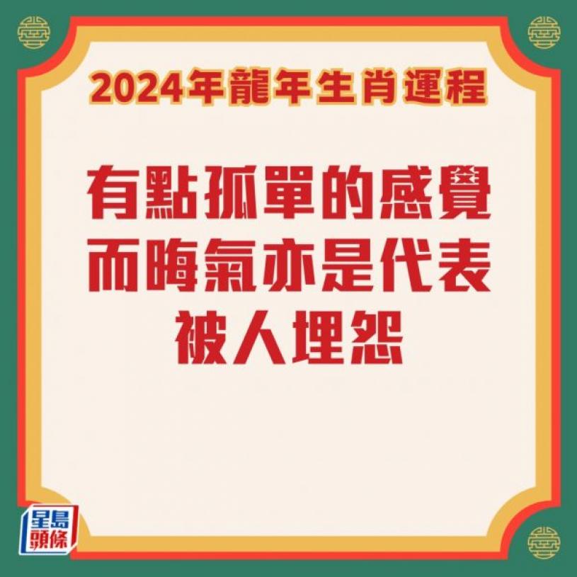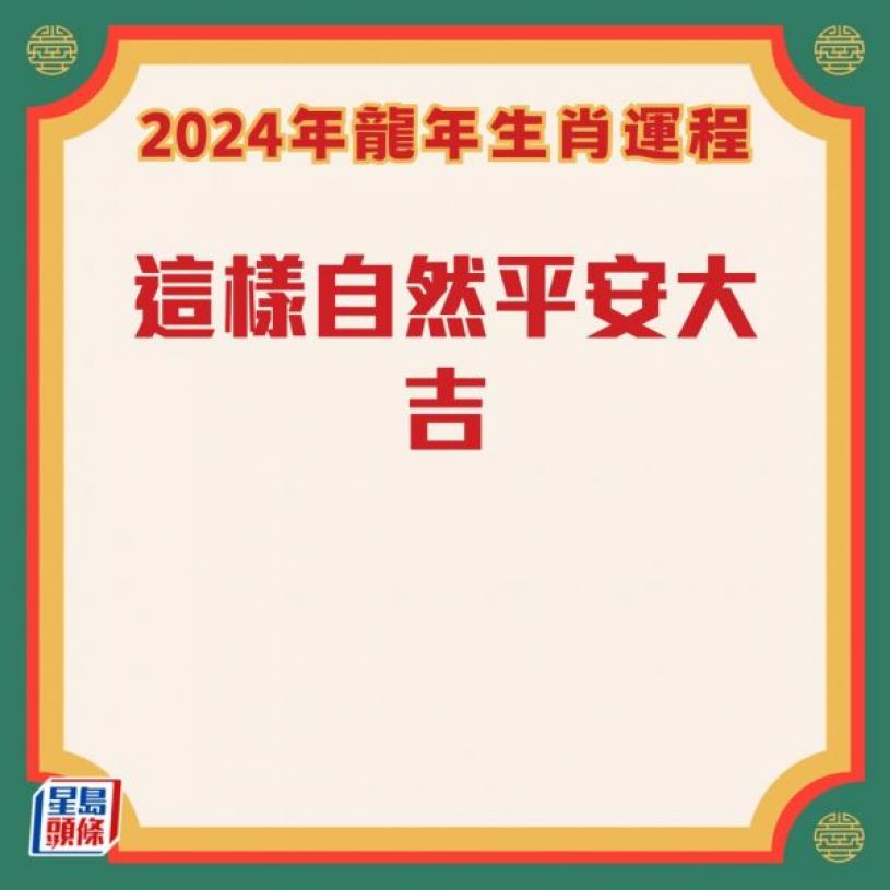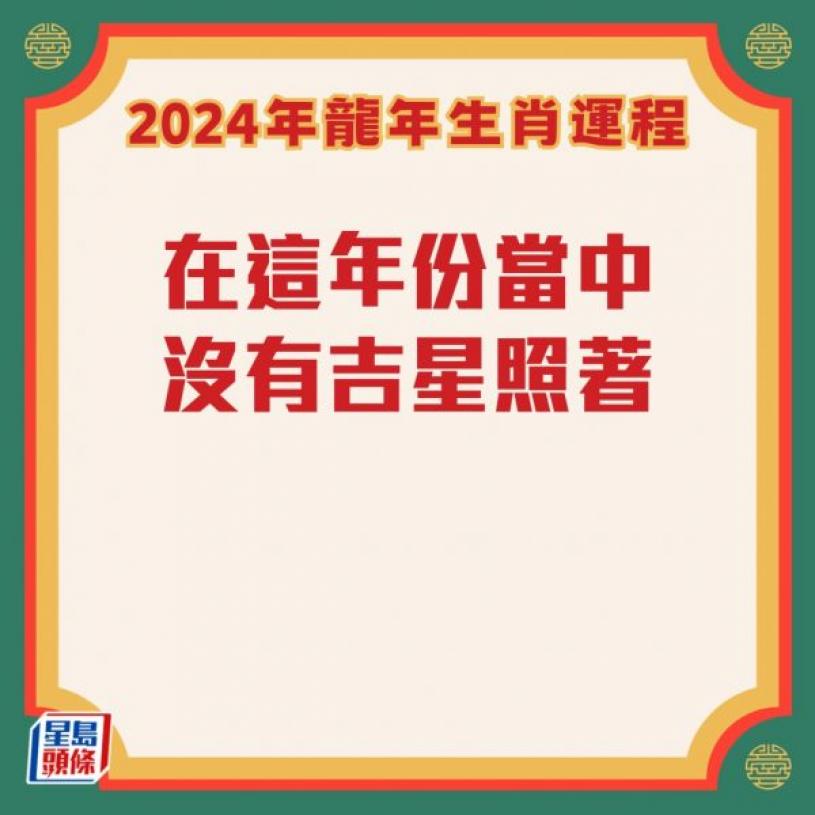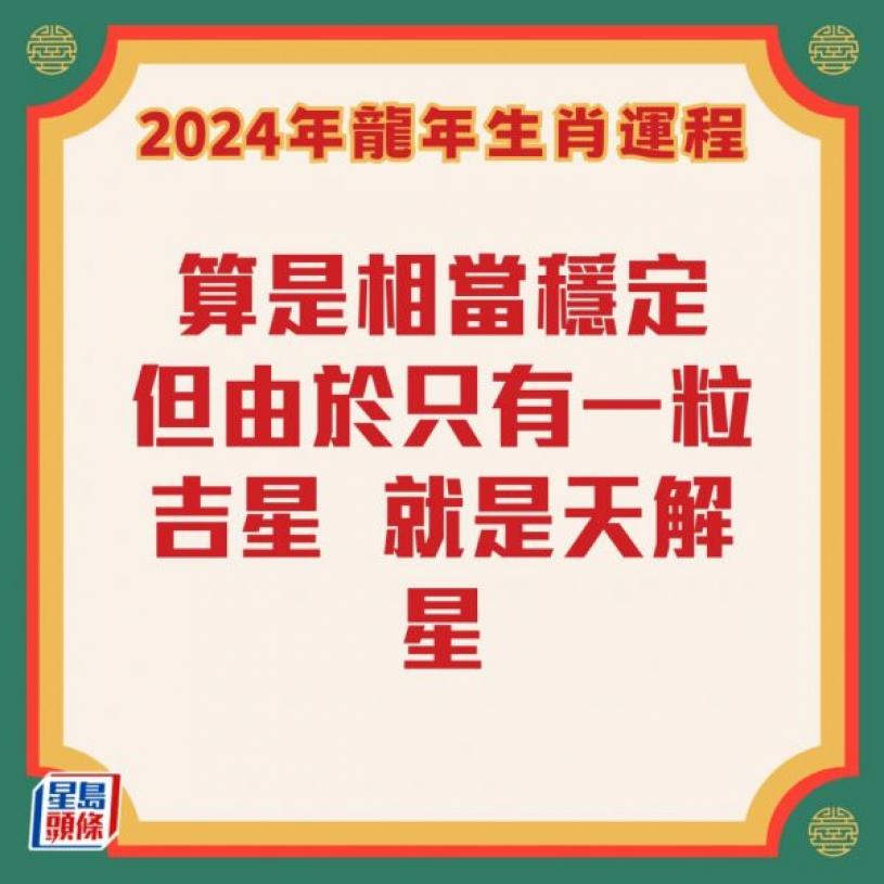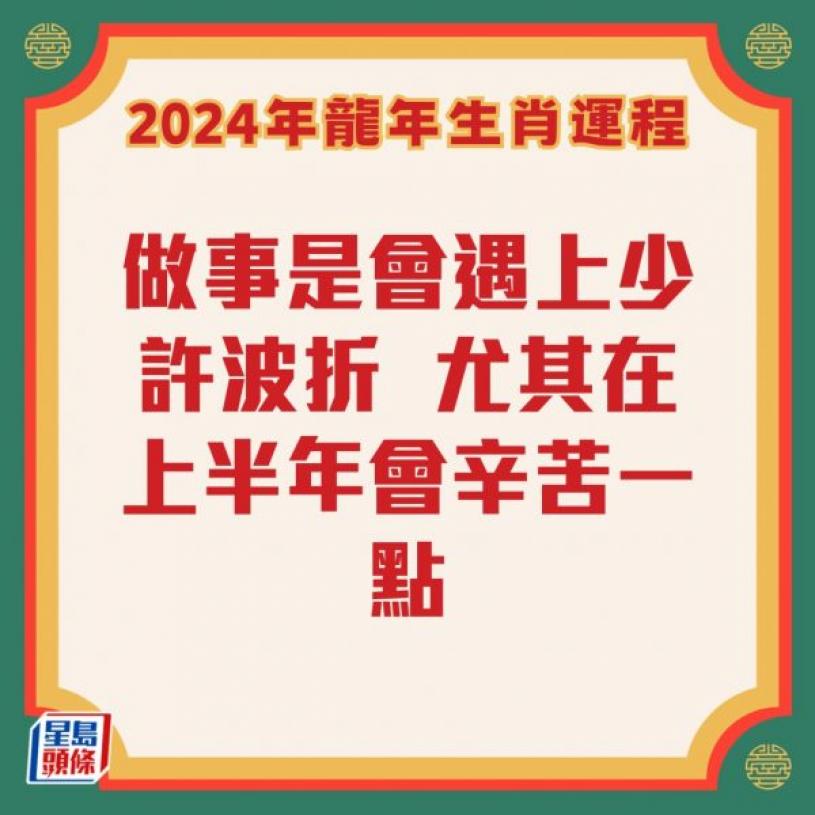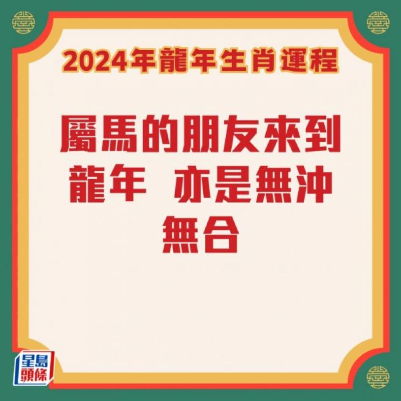 屬馬的朋友來到龍年亦是無沖無合,算是相當穩定,但由於只有一粒吉星就是天解星,天解並不是完全的吉星,代表有困難才可解決,是半吉半凶,有這星的話 是代表先難後易,所以在這情況之下,屬馬的朋友今年要有心理準備,做事是會遇上少許波折,尤其在上半年會辛苦一點。