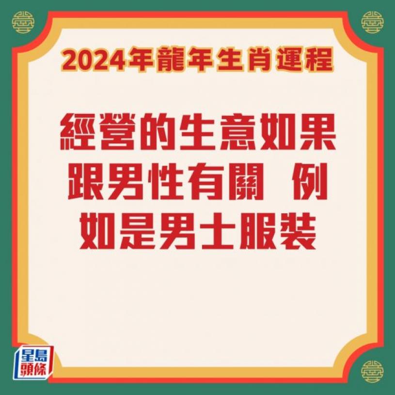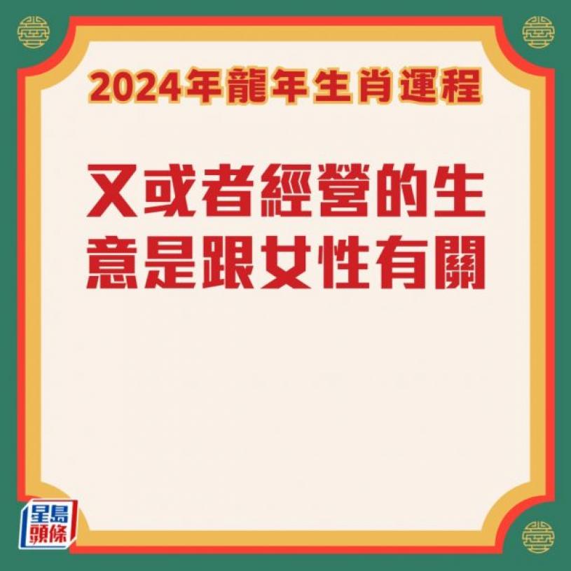 屬羊的朋友來到龍年,有天乙貴人星以及太陰星。天乙是大貴人星,今年在人際關係方面算是相當不錯,而太陰本身是一個女性的貴人星,亦是一個財星,所以在這年份當中,會容易遇到女性貴人,如本身的老闆是女性,又或者經營的生意是跟女性有關,例如是女士服裝或是美容化妝,今年的財運算是相當不錯。