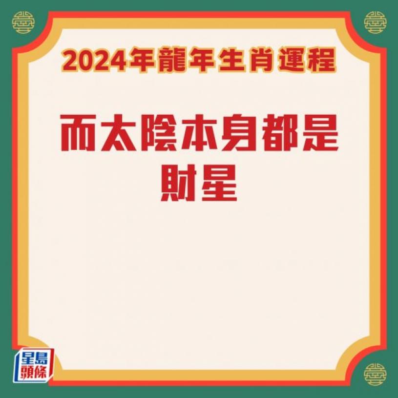 太陰本身都是財星,在投資方面都會有得著,但太陰並不是急進的財星,所謂財不入急門,今年在投資方面都不能太進取。至於凶星方面有貫索星及勾絞星,貫索是代表金錢的苛索,今年如跟別人合夥要清楚一點,因為很容易因財失義,感情方面亦容易桃花破財,所以在這年份當中,最好不要跟異性合資做生意,但始終有太陰星,今年屬羊的男士會容易遇到比自己年紀大一點的女生,如不介意姊弟戀的話,是可以開展這段感情。