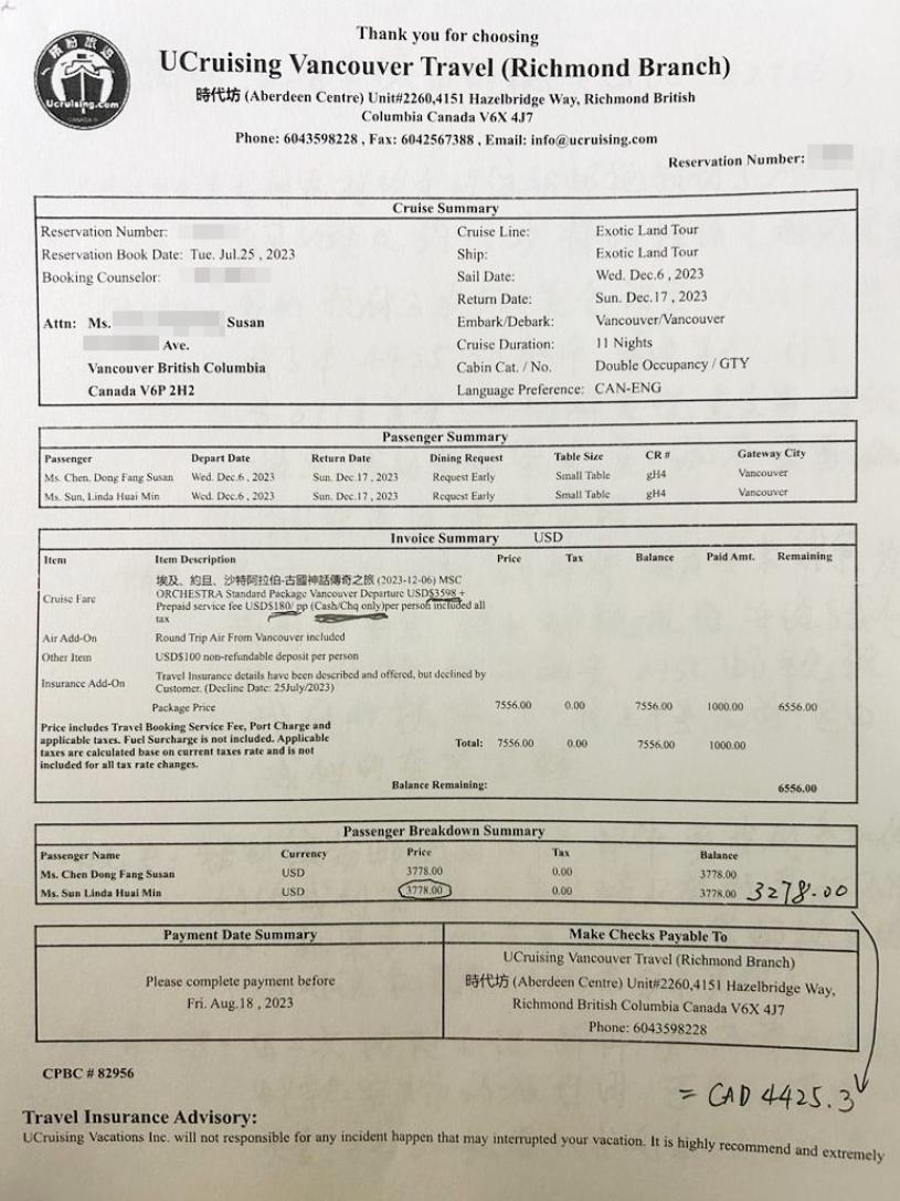 Linda和Lisa向星岛记者说,她们去年7月邀请另外两位女性友人,计划搭乘邮轮去探索没去过的地方,因此向温哥华缤纷邮轮(UCruising Vancouver Travel)列治文分社,预定“埃及、约旦、沙特阿拉伯的古国神话传奇之旅”11天的套装行程,团费含温哥华出发来回机票,订金为每人500美元,至8月总计每人以“现金”支付团费4425加元(即3778美元)。