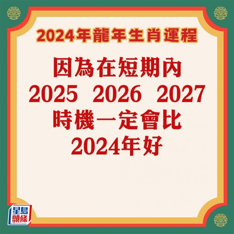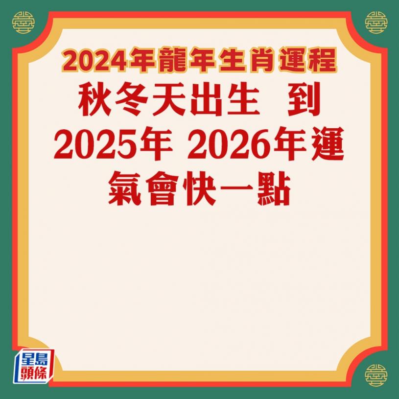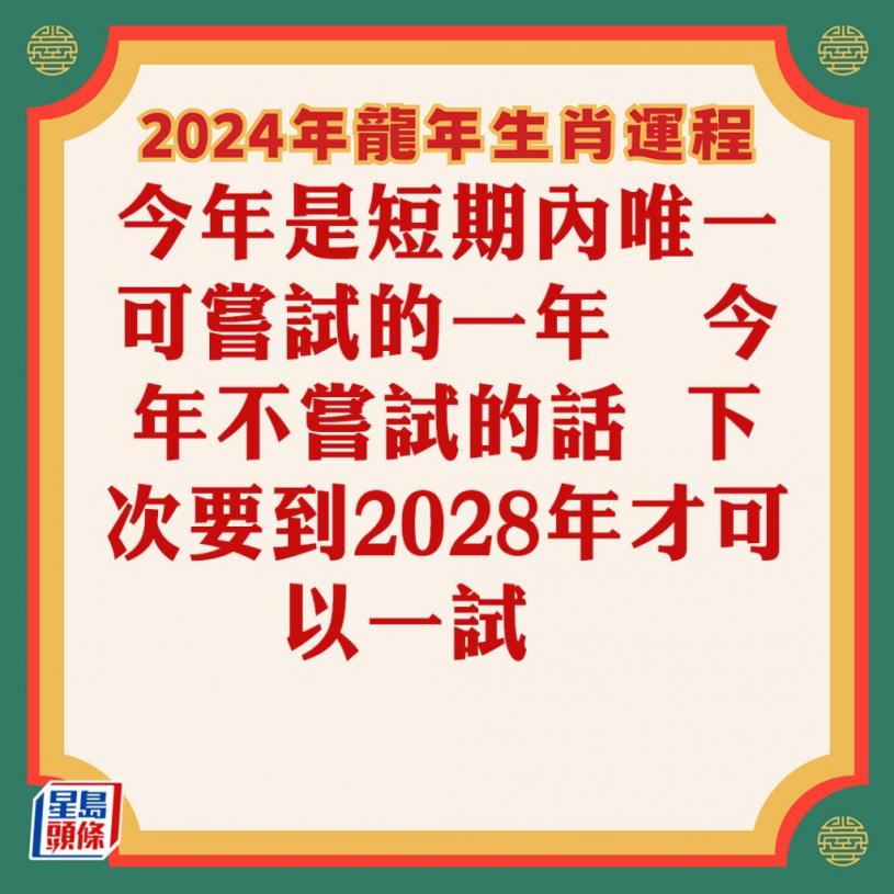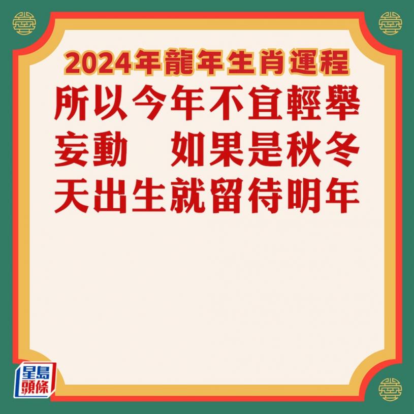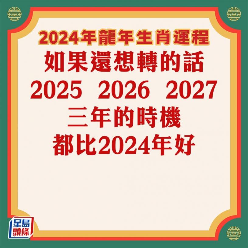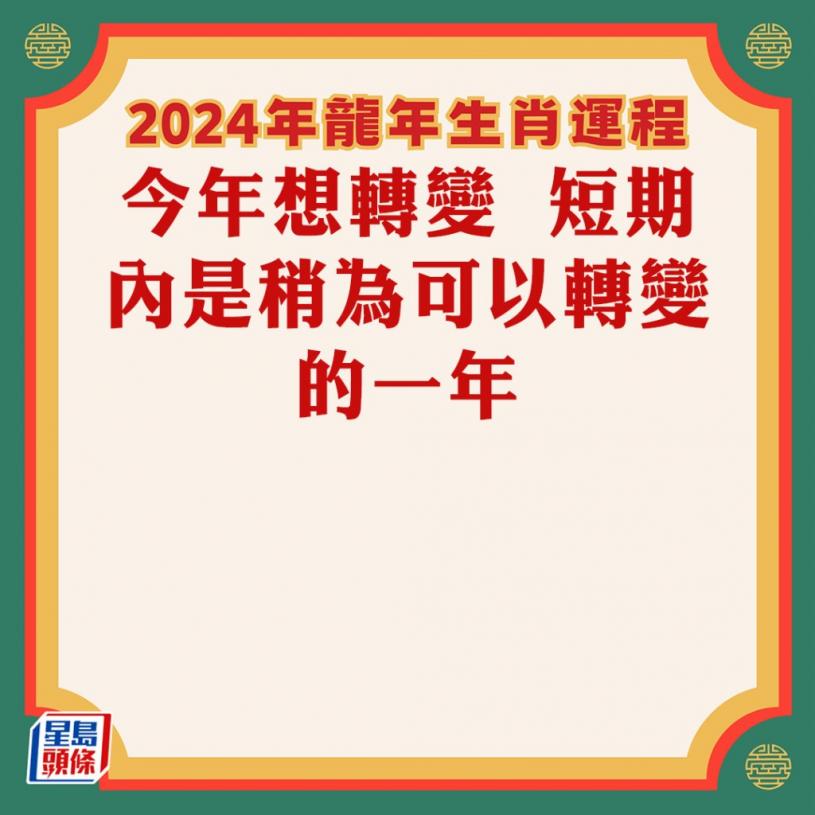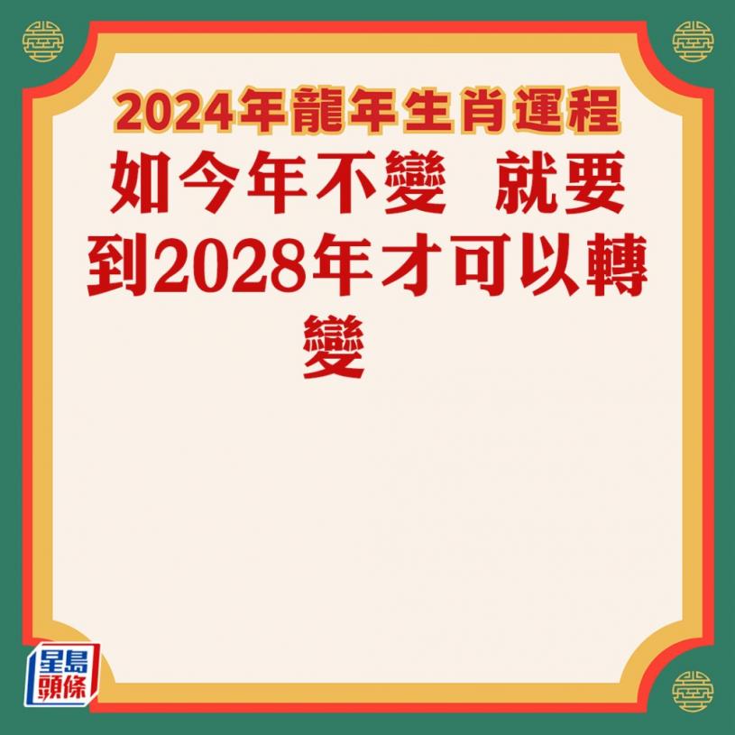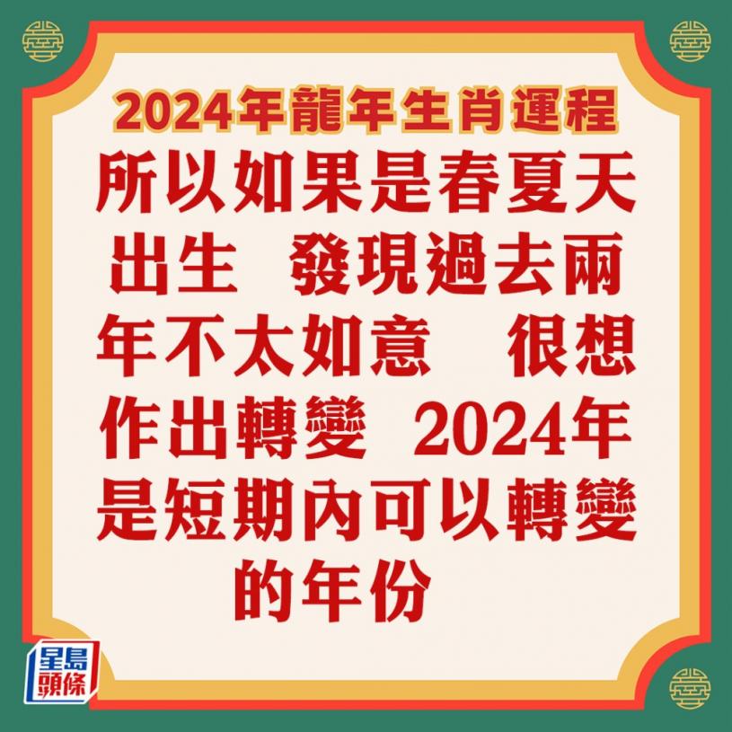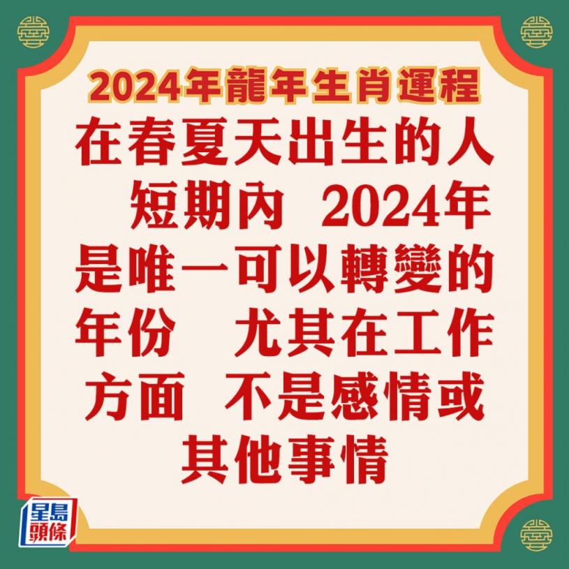 春夏天出生的人,如发现过去两年不太如意想作出转变,2024年是短期内可以转变的年份,如今年不变,就要到2028年才可以转变。相反,如果是在秋冬天出生,即是八月八日至三月六日出生,如可以不变的话,今年要按兵不动,因为在短期内2025年至2027年的时机一定会比2024年好。