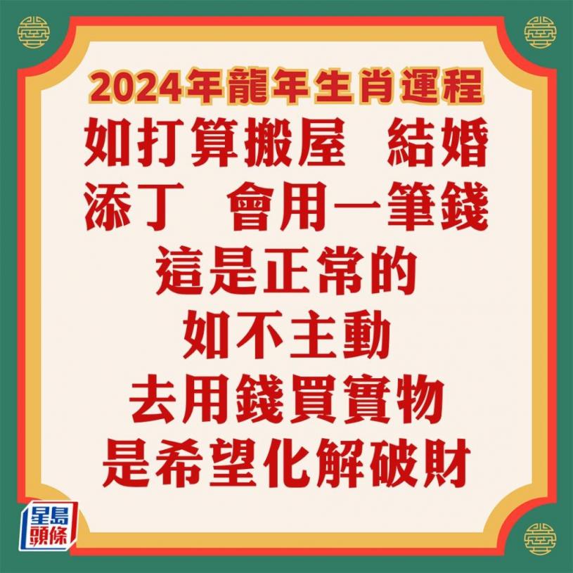 属狗今年是冲太岁,“冲”代表动荡及变化,有迁移外出变化之象,即是会有感情、住屋及事业变化。住屋变化没有所谓,因为2024年之后进入九运,九运是没有衰旧屋,只有旺财不旺丁或是旺丁不旺财,所以搬屋不需要特别留意。至于事业变化,因为今年是水火互换年,如果是春夏天出生,今年想转变的话,在短期内是稍为可以转变的一年。如果是秋冬天出生又好想转变,转变之后短期内可能不是很如意。不过到2025年至2027年是会好一点,所以春夏天出生今年可以转变,秋冬出生如不着急又有选择的话,2025年转变会比2024年好。