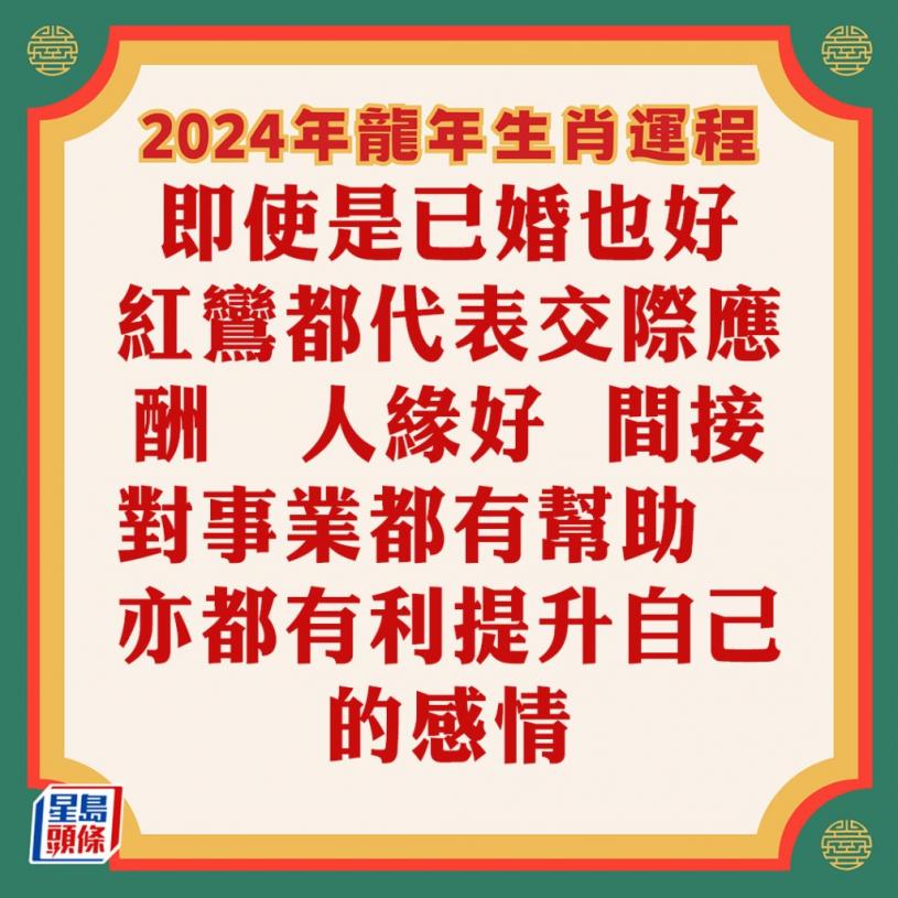 属猪的真要恭喜,因为属猪今年有红鸾桃花,红鸾比天喜更厉害。红鸾是正桃花,什么是正桃花?如果是单身会容易认识可以发展的感情,这就是正桃花。如拍拖已久就有婚嫁的机会,即使是已婚也好,红鸾都代表交际应酬人缘好,间接对事业都有帮助,亦都有利提升自己的感情。
