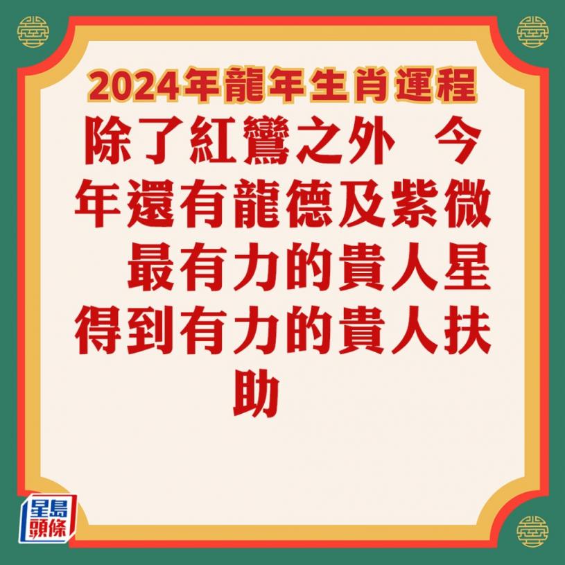 除了红鸾之外,今年还有龙德及紫微,是最有力的贵人星,得到有力的贵人扶助。红鸾、龙德、紫微这三粒星都比较有用,在人缘及贵人星方面最有力,所以属猪桃花排第一,财运排第三,属于中上的生肖。