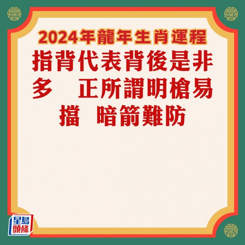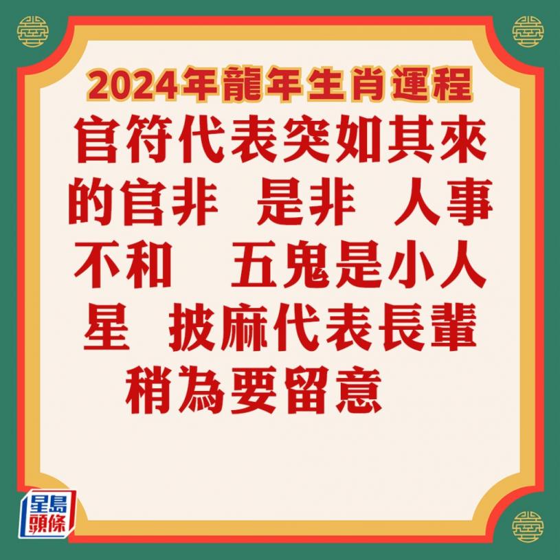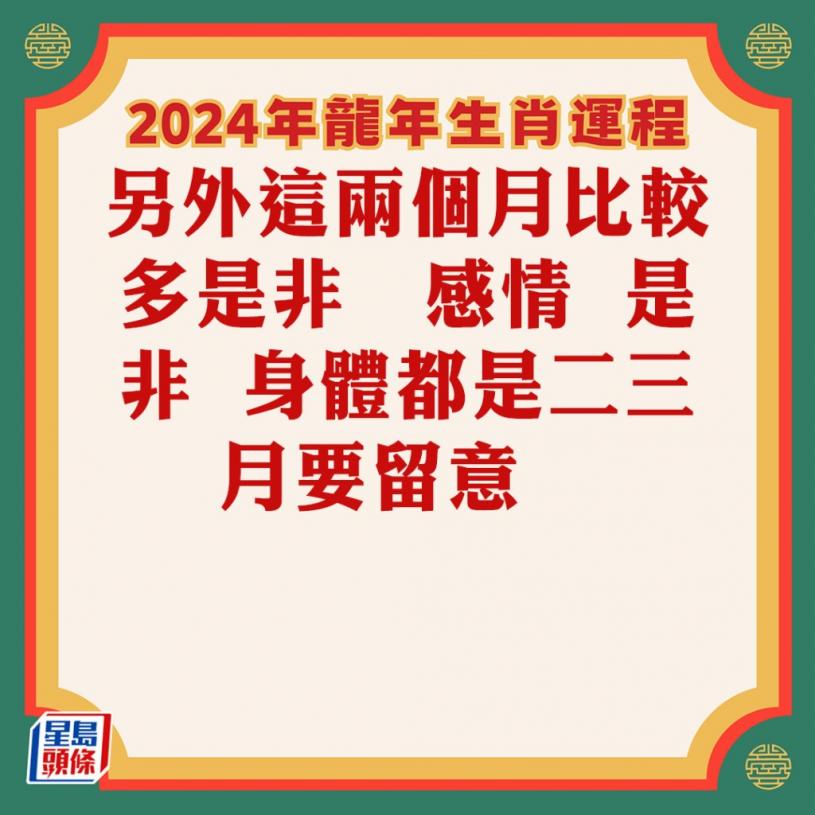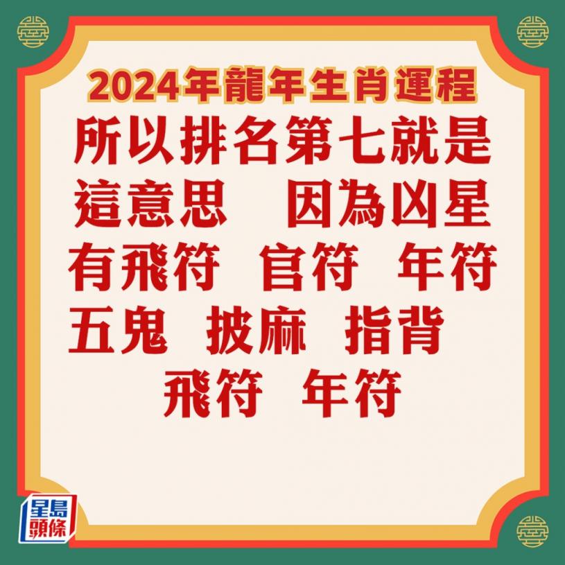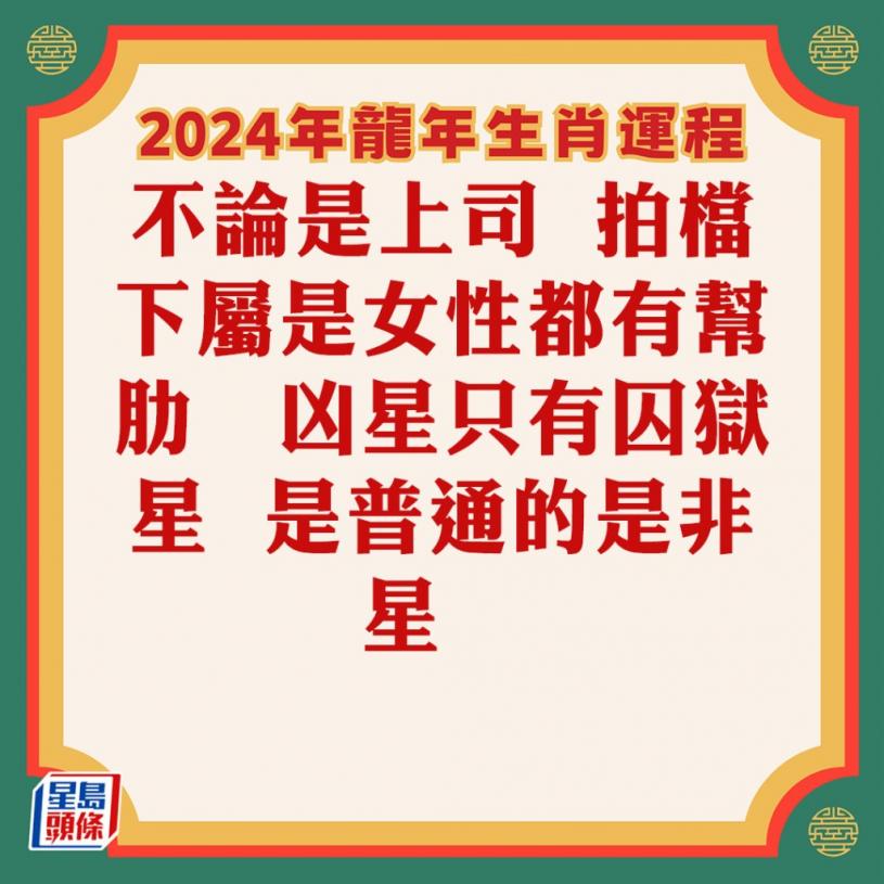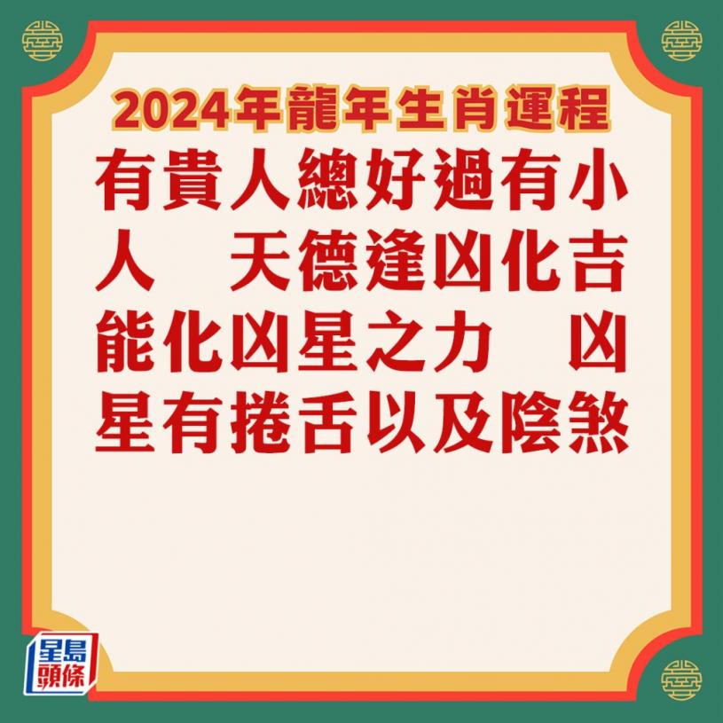 凶星有亡神代表失物,容易遗失银包、锁匙、手提电话及私人物件。特别要留意的是天官符,是普通的是非星,不过,今年又有贵人又有红鸾,是非星发挥不到大的作用。不论春夏秋冬出生的人都可以看高一线,只不过2024年是大水年,对春夏天出生的人稍为有利。
